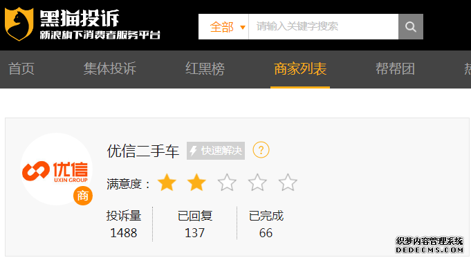 聚投訴數(shù)據(jù)顯示,截至2020年7月8日下午17:00,優(yōu)信投訴量達2128條,投訴內(nèi)容多和“套路貸”有關,解決率為35.86%;黑貓投訴上關于優(yōu)信的投訴有1488條,已完成解決量僅為66條。