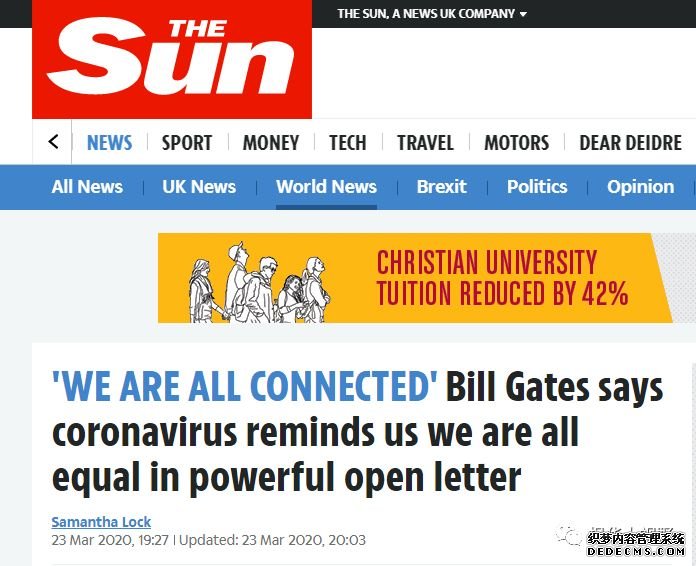 今天英國《太陽報》 刊登了比爾蓋茨的公開信,這封信得到極大關注,得到很多人轉發(fā),人們稱贊比爾蓋茨是真正的智者,并有人第一時間就把他的公開信翻譯成中文。下面是比爾蓋茨的信內容。********************** 我堅信發(fā)生的每一件事后面都有一個精神層面的目的,無論我們認為是好還是壞。 當我沉思時,我想與大家分享我的心得,新冠病毒究竟對我們做了些什么。 1) 病毒提醒我們,人都是平等的,無論我們的文化、宗教、職業(yè)、經(jīng)濟狀況,或是一個人有多么出名。在病毒眼中我們都是平等的,也許我們也應該平等對待他人。如果你不相信我的話,那就去問湯姆·漢克斯。 2) 病毒提醒我們,我們的命運都是聯(lián)在一起的,影響一個人的事情同時也會影響另一個人。病毒也提醒我們,我們建立的虛假國境線毫無價值,因為病毒并不需要護照。病毒還提醒我們,雖然我們暫時受到壓迫,世界上還有人一生都受到壓迫。 3) 病毒提醒我們,健康多么珍貴。而我們卻忽視健康,吃垃圾食品,喝被各種化學品污染的水,如果我們不照顧自己,我們當然就會生病。 4) 病毒提醒我們,生命苦短,什么是我們應該做的最重要的事情,特別是那些已經(jīng)生病的老年人。人生在世的目的不是買一卷卷的廁紙。 5) 病毒提醒我們,我們的社會已經(jīng)變得物質至上,當我們遇到困難時,我們才想起我們的基本需求是食物、飲水和藥品,而不是并沒有什么價值的奢侈品。 6) 病毒提醒我們,家庭是何等重要,但我們卻忽視了這一點。病毒強迫我們回到我們的房子里,所以我們可以把房子建成家庭,并建立牢固的家庭紐帶。 7) 病毒提醒我們,我們真正的工作并不是我們打的那份工,我們固然需要打工,然而上帝創(chuàng)造我們的目的并不是讓我們打工。我們真正的工作是互相照顧、互相保護、互助互利。 8) 病毒提醒我們,我們不能妄自尊大。病毒還提醒我們,無論你覺得自己多偉大,也無論別人覺得你多么偉大,一個小小的病毒就能讓整個世界停擺。 9) 病毒提醒我們,自由掌握在我們自己手中。我們可以選擇合作互助、分享、付出、互相支持,或者我們也可以選擇自私、囤積和自顧自。只有在困難的時候才能看出一個人的真面目。 10) 病毒提醒我們,我們既可以耐心,也可以恐慌。我們既可以理解這種情況在歷史上已經(jīng)發(fā)生過多次,但最后都過去了,我們也可以恐慌,以為世界末日到了,結果傷害了我們自己。 11) 病毒提醒我們,疫情既是結束也是開始。我們現(xiàn)在可以反省和理解,從錯誤里吸取教訓。疫情也可以是一個輪回的開始,而且還會繼續(xù)下去,直至我們吸取教訓為止。 12) 病毒提醒我們,我們的地球病了。病毒還提醒我們,我們必須看到森林消失的速度,也必須看到一卷卷廁紙從貨架上消失的速度。我們都病了,因為我們的家庭病了。 13) 病毒提醒我們,困難總會過去,然后就容易了。生活是周期性的,現(xiàn)在只是周期里的一個階段。我們不必恐慌,疫情一定會過去。 14) 許多人認為新冠病毒的疫情是一場災難,但我覺得這是一次“偉大的糾錯”。 下面是《太陽報》刊登的原文: